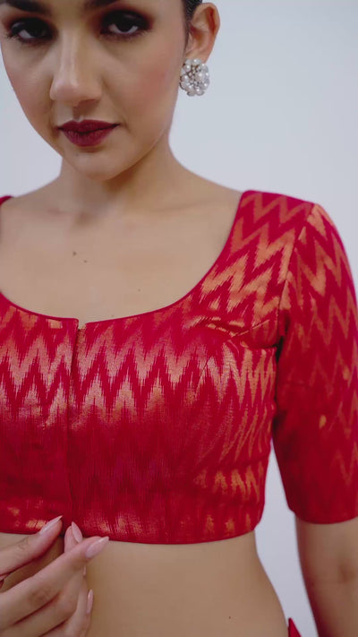 Product Description Elevate your ethnic wardrobe with this stunning zigzag woven blouse, designed to complement a wide range of sarees and festive ensembles. Crafted from premium brocade-inspired fabric, this readymade blouse features a luxurious sheen and a beautifully intricate chevron pattern that adds richness to your traditional look. The fabric sits comfortably on the skin while offering a structured fit that enhances your silhouette.