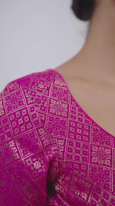 Product Description Elevate your ethnic wardrobe with this exquisitely crafted Banarasi brocade readymade blouse, designed to add effortless elegance to any saree look. Featuring a luxurious woven pattern inspired by traditional Banarasi artistry, this blouse showcases intricate golden motifs arranged in a rich geometric design that shines beautifully under light. The premium fabric not only offers a sophisticated sheen but also ensures lasting comfort for long hours of wear.