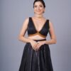 This elegant black silk sleeveless blouse combines sophistication and allure. Crafted from luxurious silk, the blouse features a sleek, fitted design that accentuates the body’s natural curves. The deep neckline adds a touch of drama, making it perfect for a glamorous evening or special occasion. The lace border below the chest adds a delicate, feminine detail, creating a striking contrast against the rich, dark fabric. The sleeveless cut ensures a chic, modern look, while the high-quality silk provides a smooth, comfortable fit. Pair it with a matching saree for a timeless and captivating ensemble.