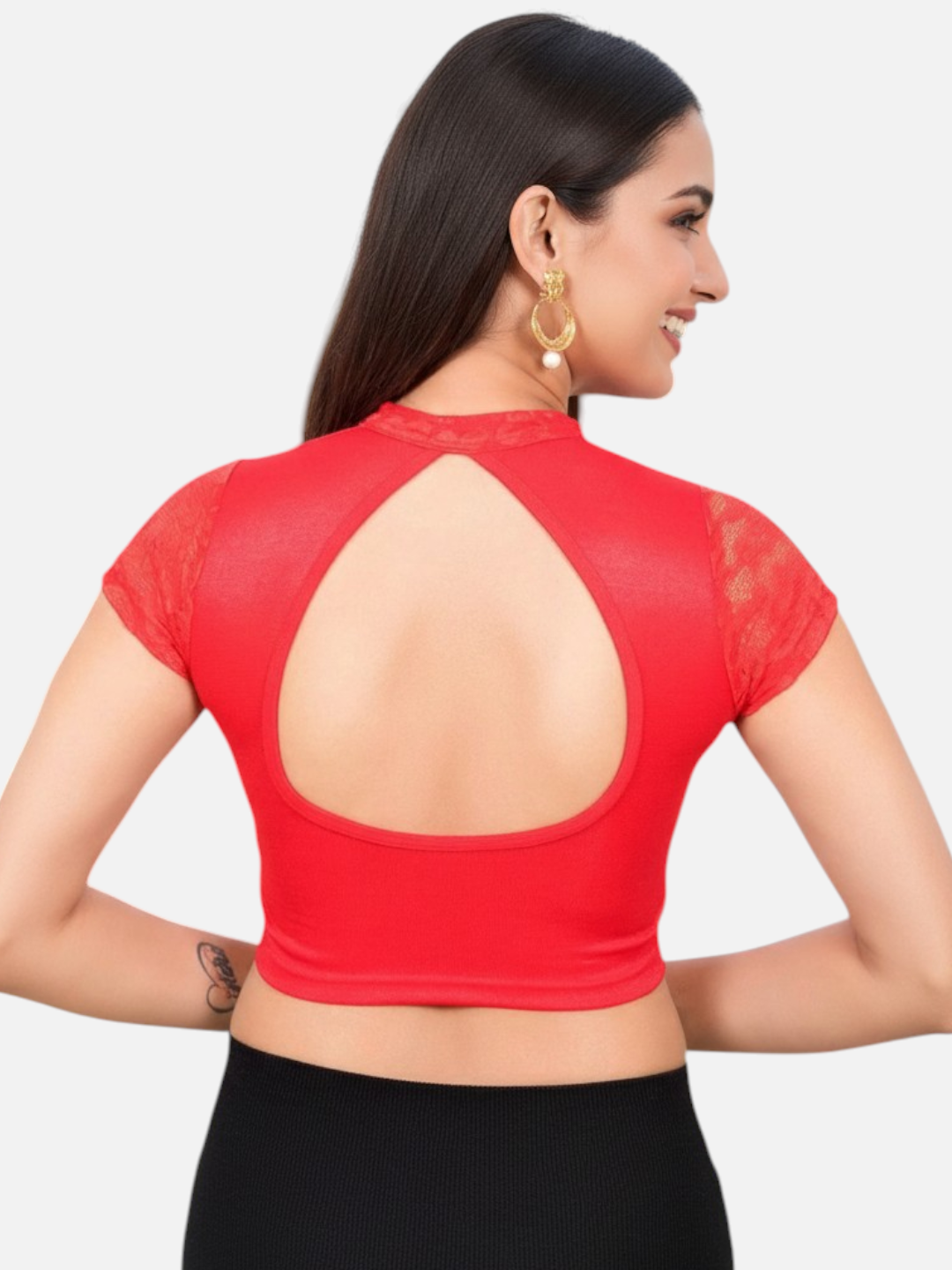 Red Lace-Yoke Stretchable Elastane Readymade Saree Blouse with Back Keyhole