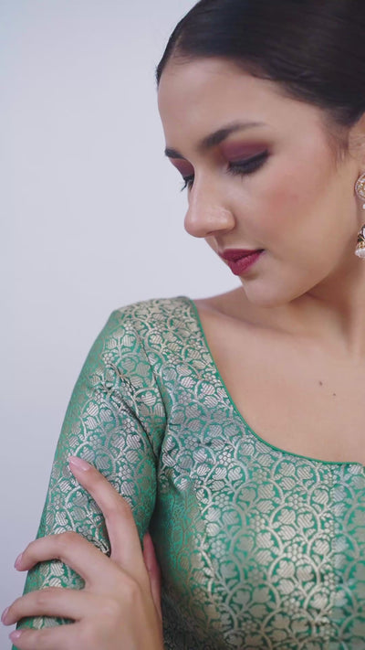 This exquisite blouse is crafted from high-quality gold brocade fabric, known for its opulent texture and timeless charm. The half sleeves add a touch of modesty and comfort, making it suitable for a variety of occasions. The round neckline frames your collarbone elegantly, enhancing your overall look.