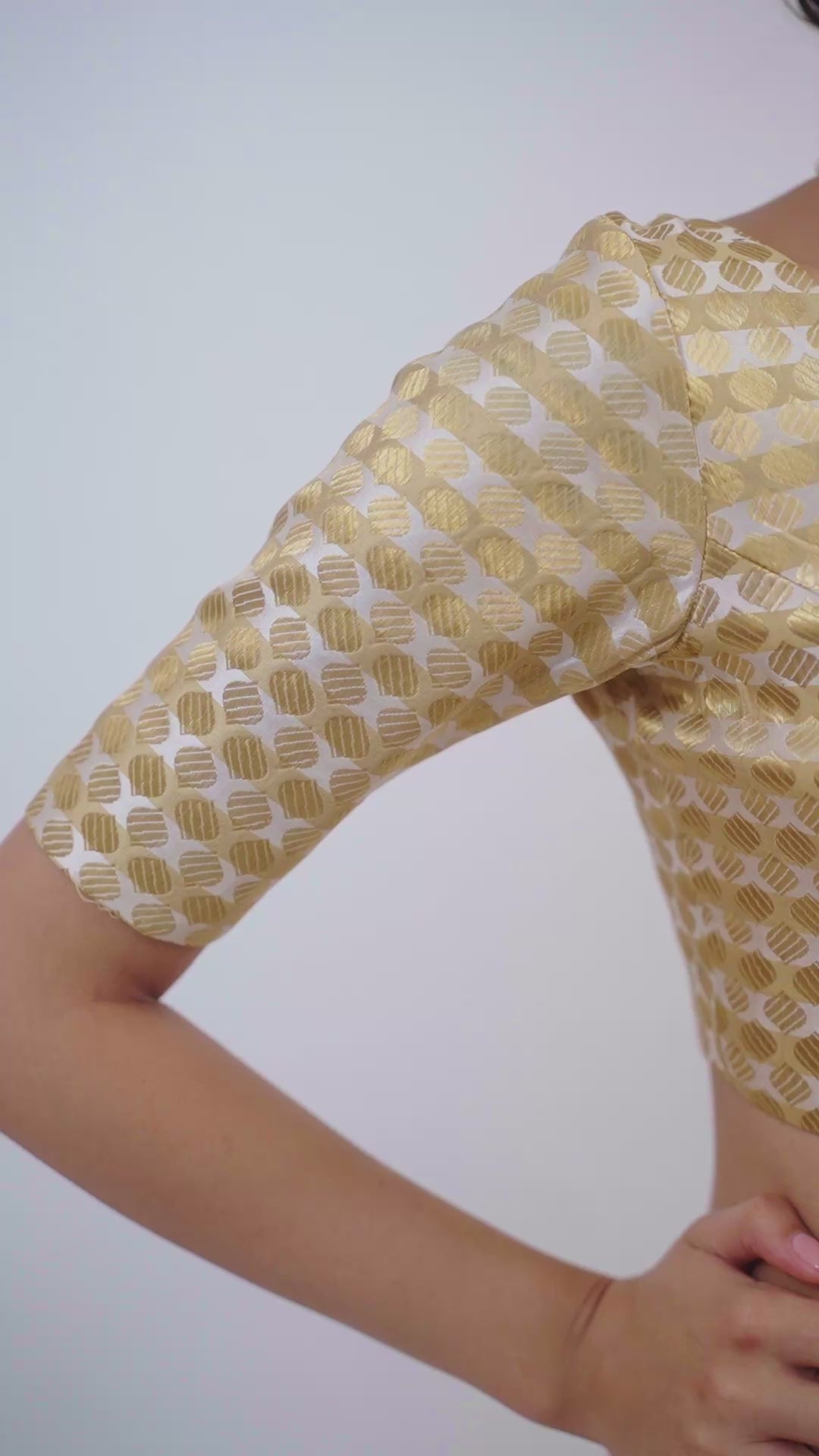 Product Description Elevate your ethnic wardrobe with this exquisite Golden Brocade Readymade Saree Blouse, designed to blend timeless elegance with modern comfort. Crafted from premium brocade fabric, the blouse showcases an intricate woven pattern in shimmering golden tones, giving it a regal and festive appeal. Featuring half sleeves for a balanced traditional look, this blouse is enhanced with a padded front for a flattering silhouette and all-day comfort. The butter crepe inner lining ensures a soft, smooth feel against your skin, keeping you comfortable during long festivities. The stylish V-neck design at the front complements various saree drapes, while the deep V-back cut adds a graceful and feminine charm. The back-open style with secure hook-and-eye closure makes it easy to wear, and the elegant dori tie-up with tassels ensures a snug fit while adding a decorative touch. Perfect for weddings, receptions, festivals, and special occasions, this ready-to-wear blouse pairs beautifully with silk, georgette, chiffon, or net sarees. Its golden hue makes it versatile enough to coordinate with a variety of colors and saree designs.