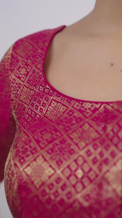 Product Description Elevate your ethnic wardrobe with this exquisitely crafted Banarasi brocade readymade blouse, designed to add effortless elegance to any saree look. Featuring a luxurious woven pattern inspired by traditional Banarasi artistry, this blouse showcases intricate golden motifs arranged in a rich geometric design that shines beautifully under light. The premium fabric not only offers a sophisticated sheen but also ensures lasting comfort for long hours of wear.