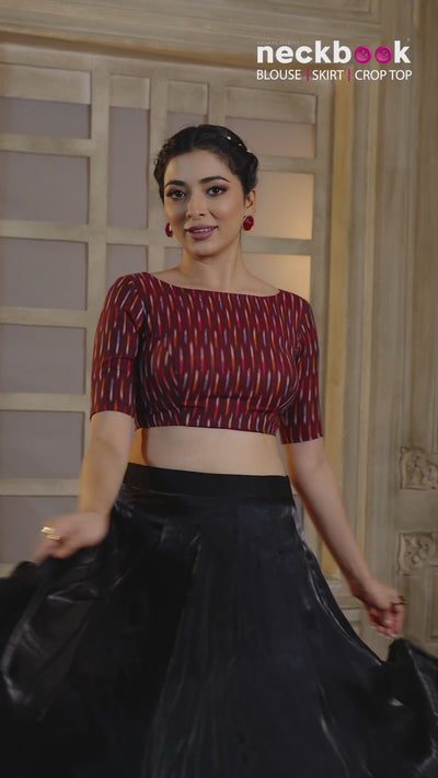 The deep maroon hue, adorned with the distinctive Ikat weave, creates a visual tapestry that celebrates both heritage and modernity. The boat neckline adds a touch of sophistication, gracefully framing the collarbone and shoulders. The half sleeves strike the perfect balance between comfort and style, making this blouse a versatile choice for various occasions. The intricate Ikat pattern, characterized by its blurred edges and captivating geometric motifs, adds an artisanal touch to the garment.