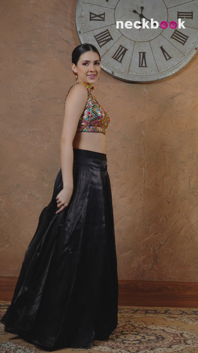 Product Description\n\nCrafted from airy georgette fabric, this blouse is adorned with a mesmerizing array of multicolor thread work and intricate mirror detailing, creating a visual tapestry that captivates the eye. The sleeveless design adds a modern touch, allowing you to showcase your shoulders gracefully, while the V neckline enhances the neckline with a touch of allure. The intricate thread and mirror work dance across the fabric, adding a dynamic and artisanal dimension to the blouse.\n\nStyle & Fit Tips\n\nPalazzo Pants for Contemporary Fusion: Embrace a fusion look by pairing the blouse with high-waisted palazzo pants. Choose a solid color or subtle pattern to let the intricate work on the blouse take center stage. Add statement earrings for a modern touch.\n\nDhoti Pants for Bohemian Vibes: Embrace a bohemian-inspired look by pairing the blouse with dhoti pants. The relaxed and draped style of the dhoti pants adds a touch of casual elegance to the overall ensemble.