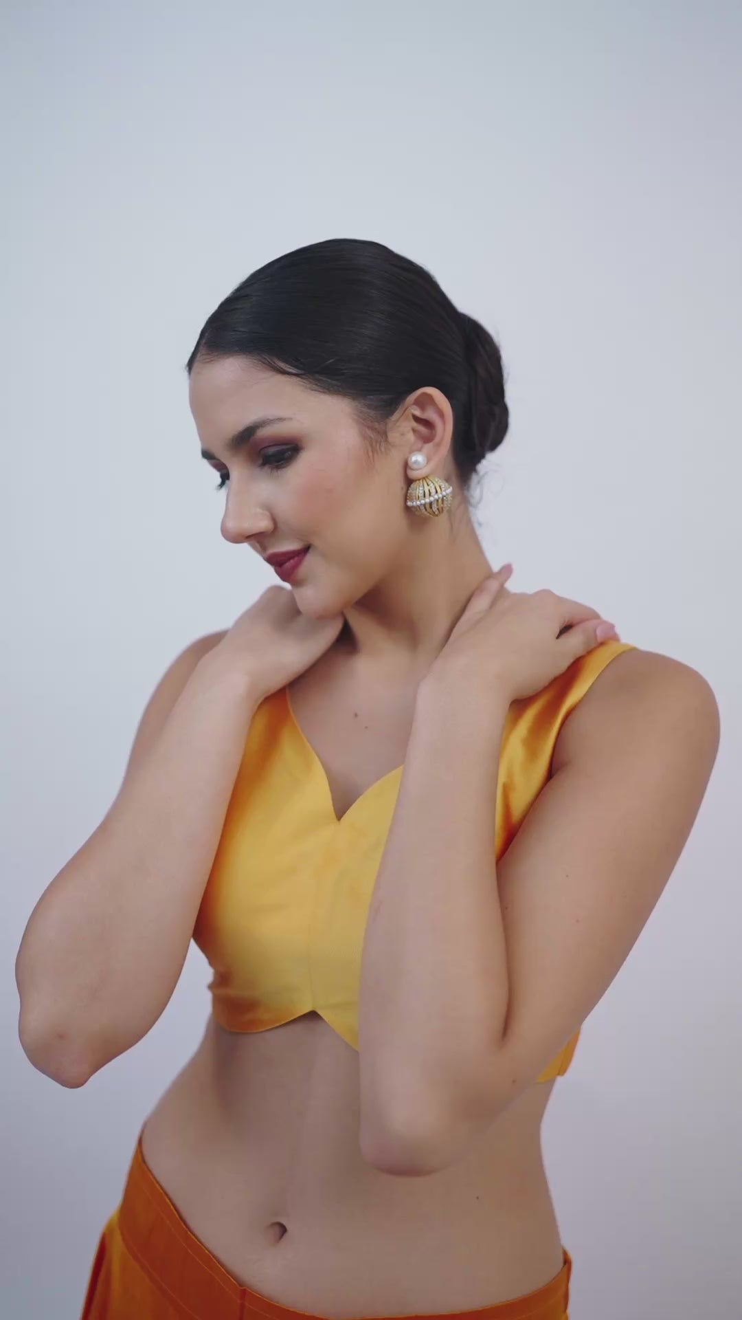 Product Description Elevate your ethnic charm with this exquisite mustard Banglori Silk Readymade Saree Blouse, designed for effortless elegance and comfort. Crafted from premium Banglori silk, this blouse features a smooth, lustrous texture that enhances its vibrant hue. The sleeveless design paired with a flattering sweetheart neckline gives it a chic and contemporary appeal, making it a perfect match for both traditional and fusion outfits. The blouse comes with soft padding for a structured fit and is lined with butter crepe fabric to ensure maximum comfort during long hours of wear. Its stylish back-open pattern with a deep V-cut adds a hint of allure, while the dainty tie-up with matching tassels lends a graceful finishing touch. Ideal for pairing with sarees or lehengas, this versatile piece is a wardrobe essential for weddings, parties, and festive celebrations. Whether you choose to style it with heavy jewelry for a grand look or keep it minimal for understated elegance, this blouse promises to be your go-to statement piece.